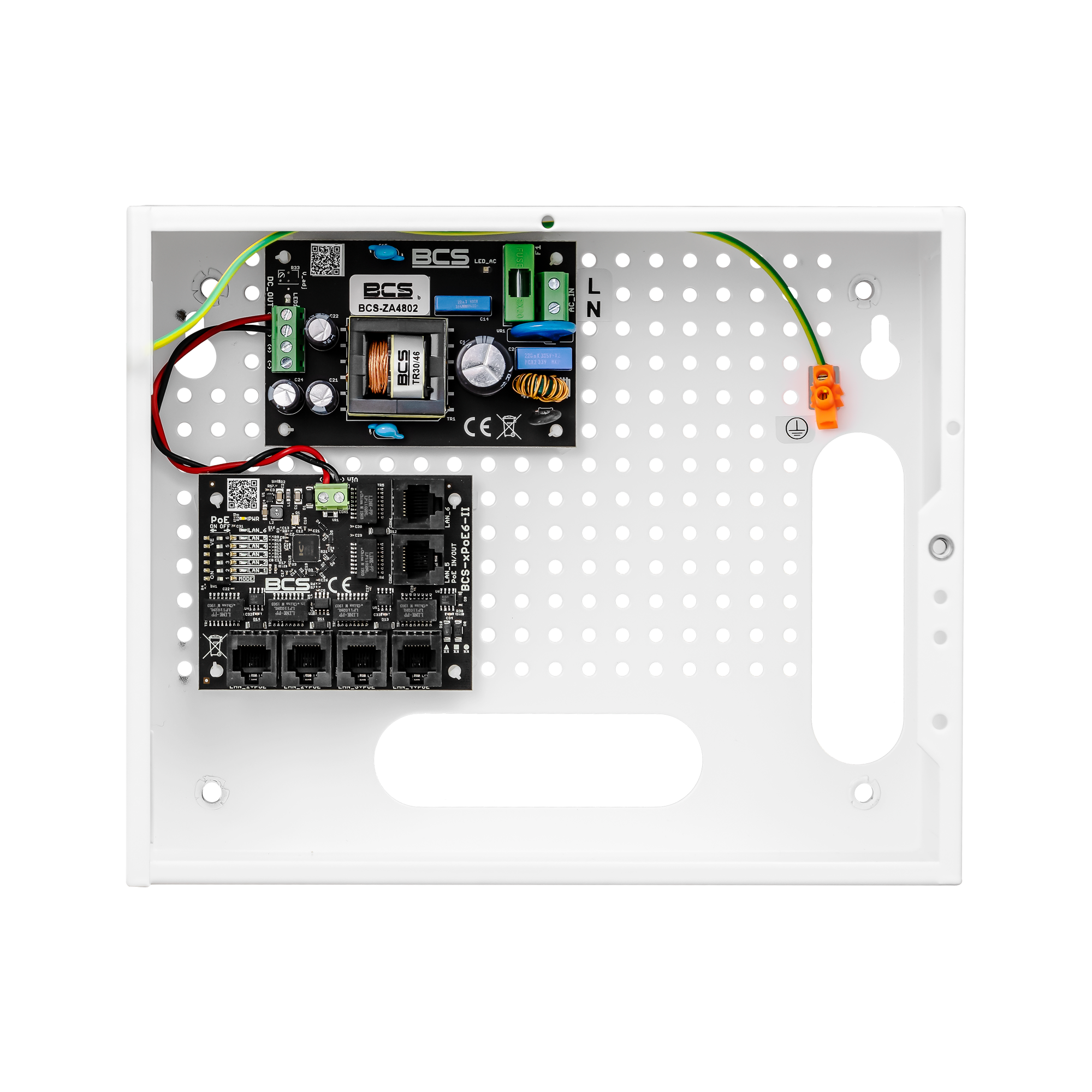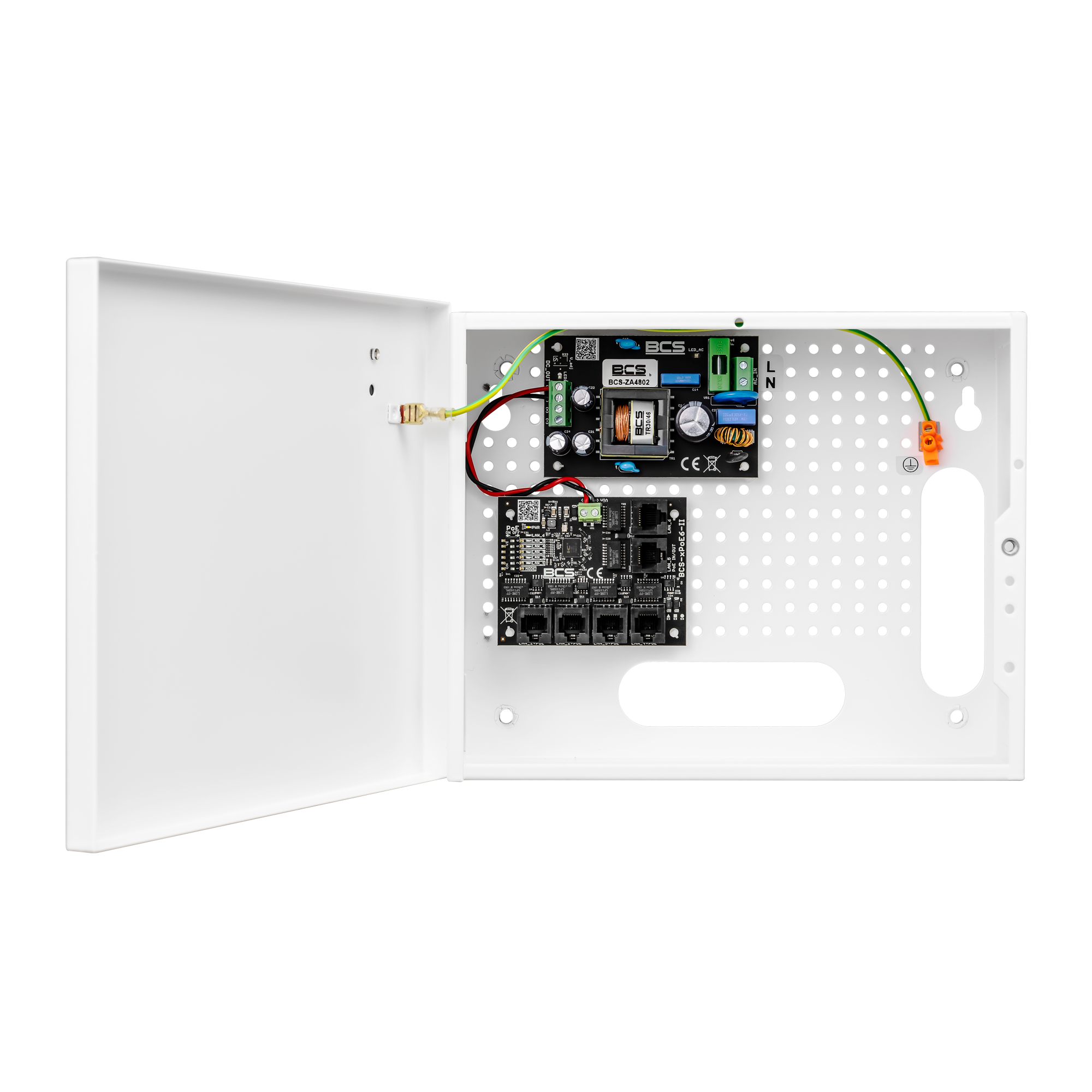 | Obudowa | Obudowa BCS-E, Materiał obudowy – blacha stalowa 0,8 mm, Obudowa malowana proszkowo na kolor biały, Zamontowany tamper otwarcia, Dystans do ściany |