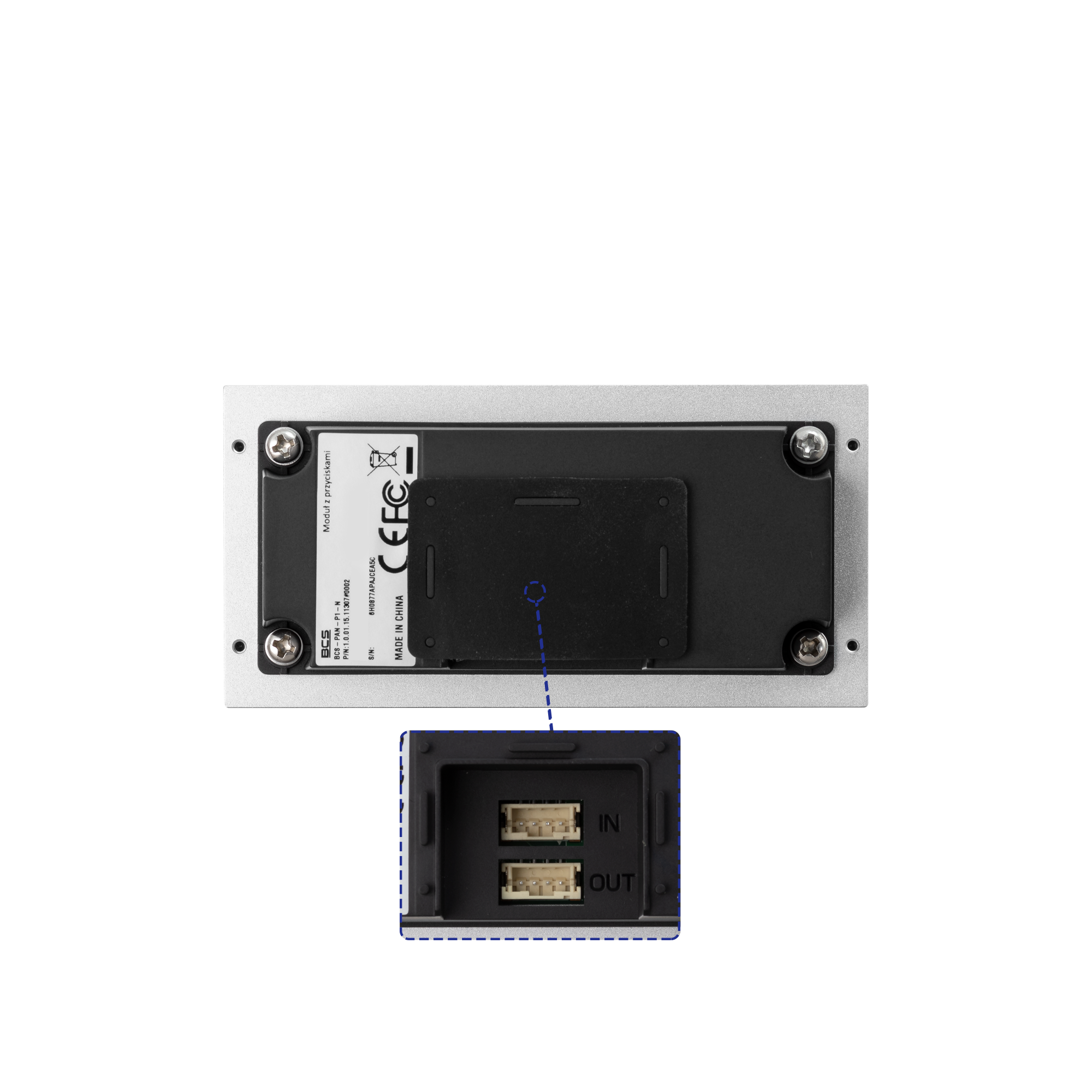 Pojedynczy moduł z przyciskiem 1 połączenia dla nowego systemu modułowego IP BCS. Umożliwia to zwiększenie liczby obsługiwanych mieszkań w systemie. Możliwość przypisania dowolnego kodu wywoławczego (numeru mieszkania) do każdego przycisku niezależnie. Przód wykonany jest z aluminium. Przeznaczony do montażu w dwóch lub trzech ramach modułów BCS-RA2-N i BCS-RA3-N. Zasilanie i transmisja danych z modułu kamery BCS-PAN-KAM-N przy użyciu taśmy modułowej dołączonej do ramy.