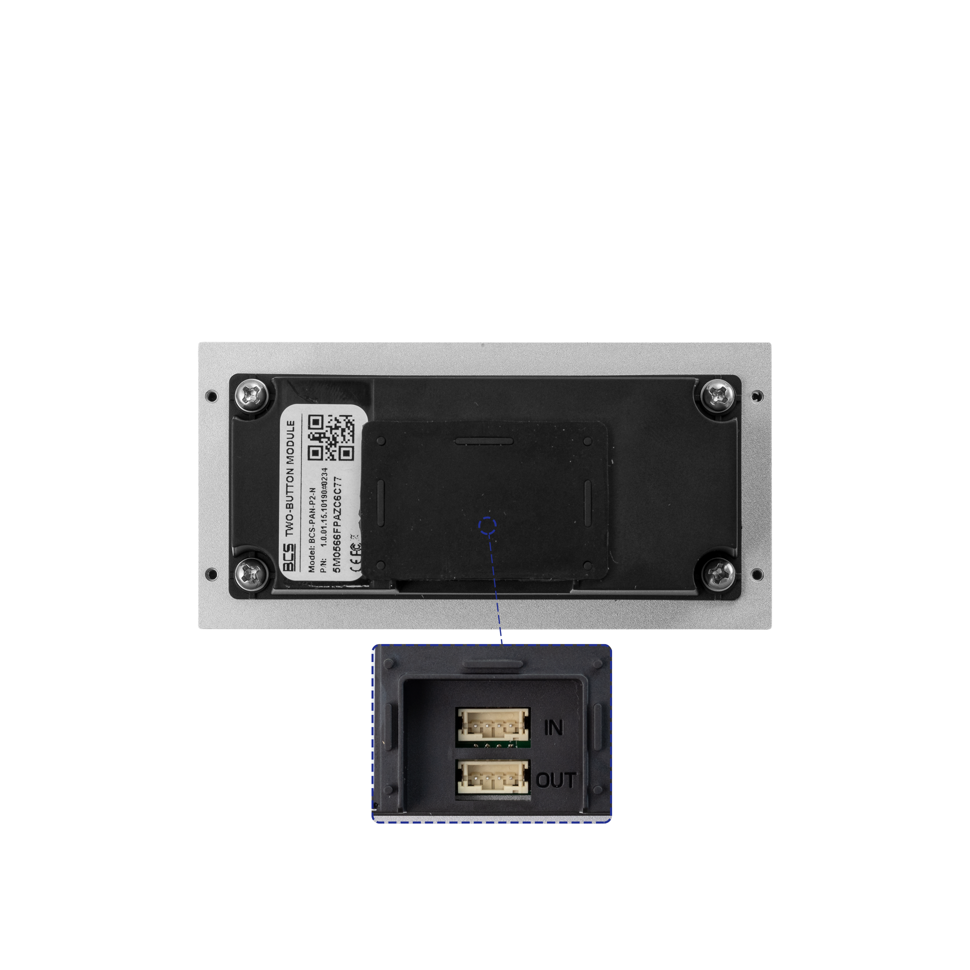 Moduł z dwoma przyciskami wywołania do systemu paneli modułowych. Montaż w dedykowanych ramkach BCS-RA1-N, BCS-RA2-N, BCS-RA3-N. Do pracy wymaga modułu kamery BCS-PAN-KAM(4).