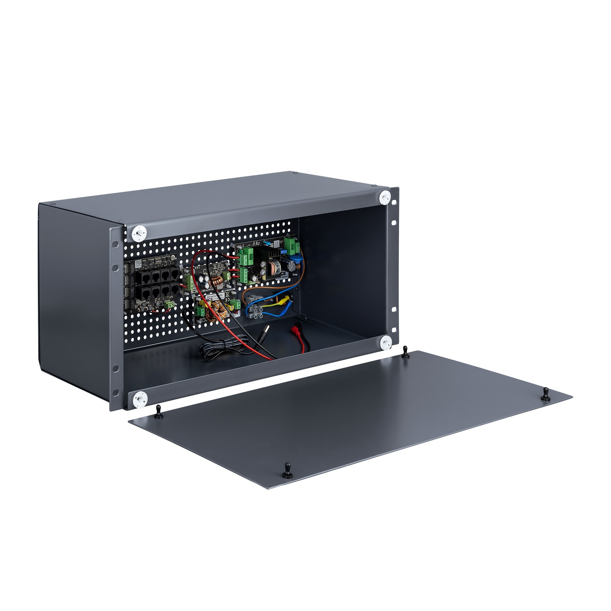 Urządzenie zamknięte jest w obudowie pozwalającej na zabudowę w szafie teletechnicznej RACK. Przemyślana i unikatowa na polskim rynku konstrukcja, umożliwia montaż w jednej obudowie urządzeń, wraz z zasilaniem buforowym i akumulatorami. Korpus produkowany jest z blachy stalowej, a pokrywa maskująca z lekkiej blachy aluminiowej. Oba elementy lakierowane proszkowo na półmatowy, grafitowy kolor RAL 7024.