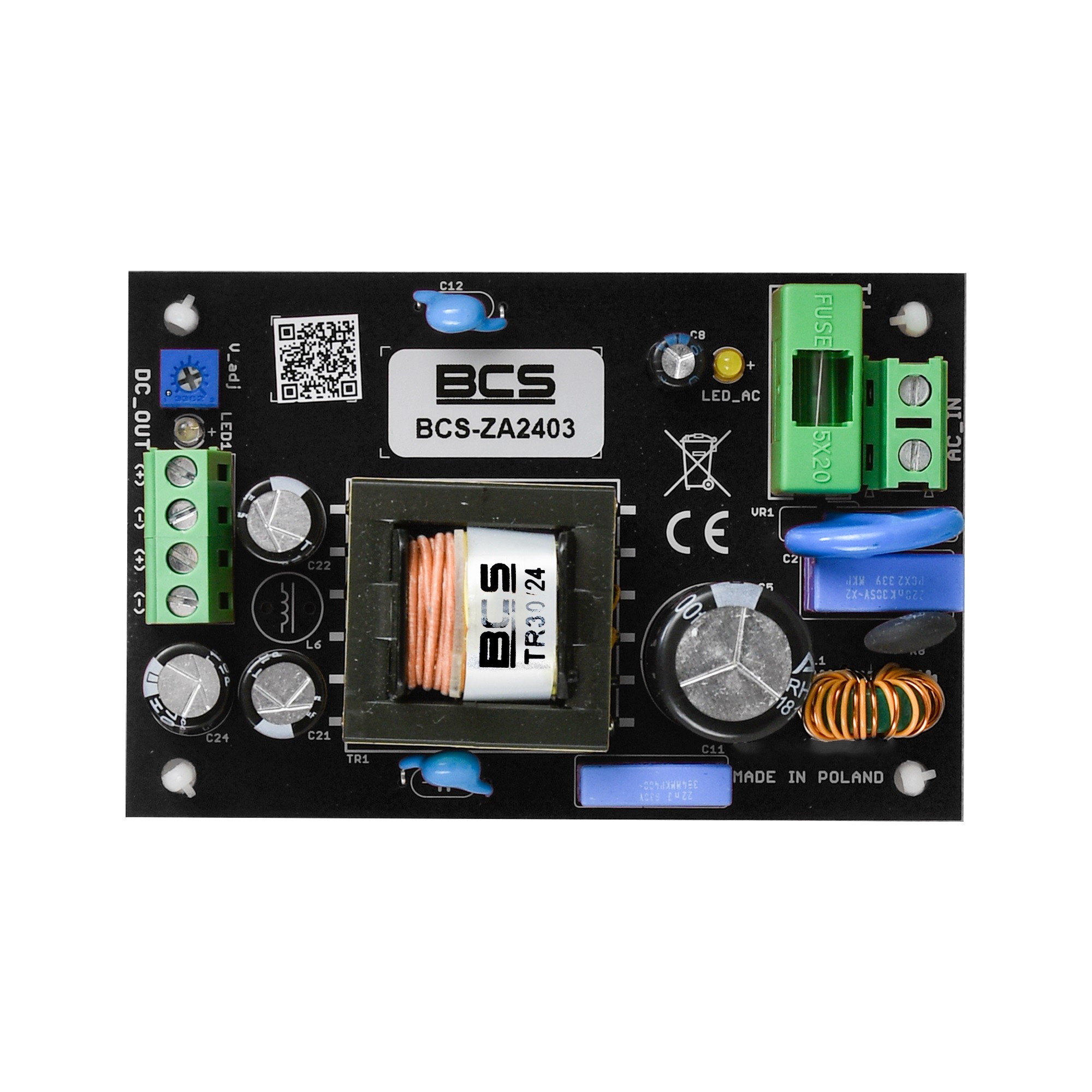 Urządzenie BCS-ZA2403 to zasilacz sieciowy dostarczający stabilnego napięcia stałego dla wymagających urządzeń elektronicznych m.in. kamer CCTV, rejestratorów itp. Dzięki integracji zabezpieczeń przeciwprzepięciowych i zwarciowych jest on polecany szczególnie do pracy w systemach monitoringu wymagających wysokiej niezawodności zasilania. Układ zasilacza to wysokosprawna przetwornica impulsowa zapewniająca izolację pomiędzy siecią 230 VAC i zasilanym urządzeniem.