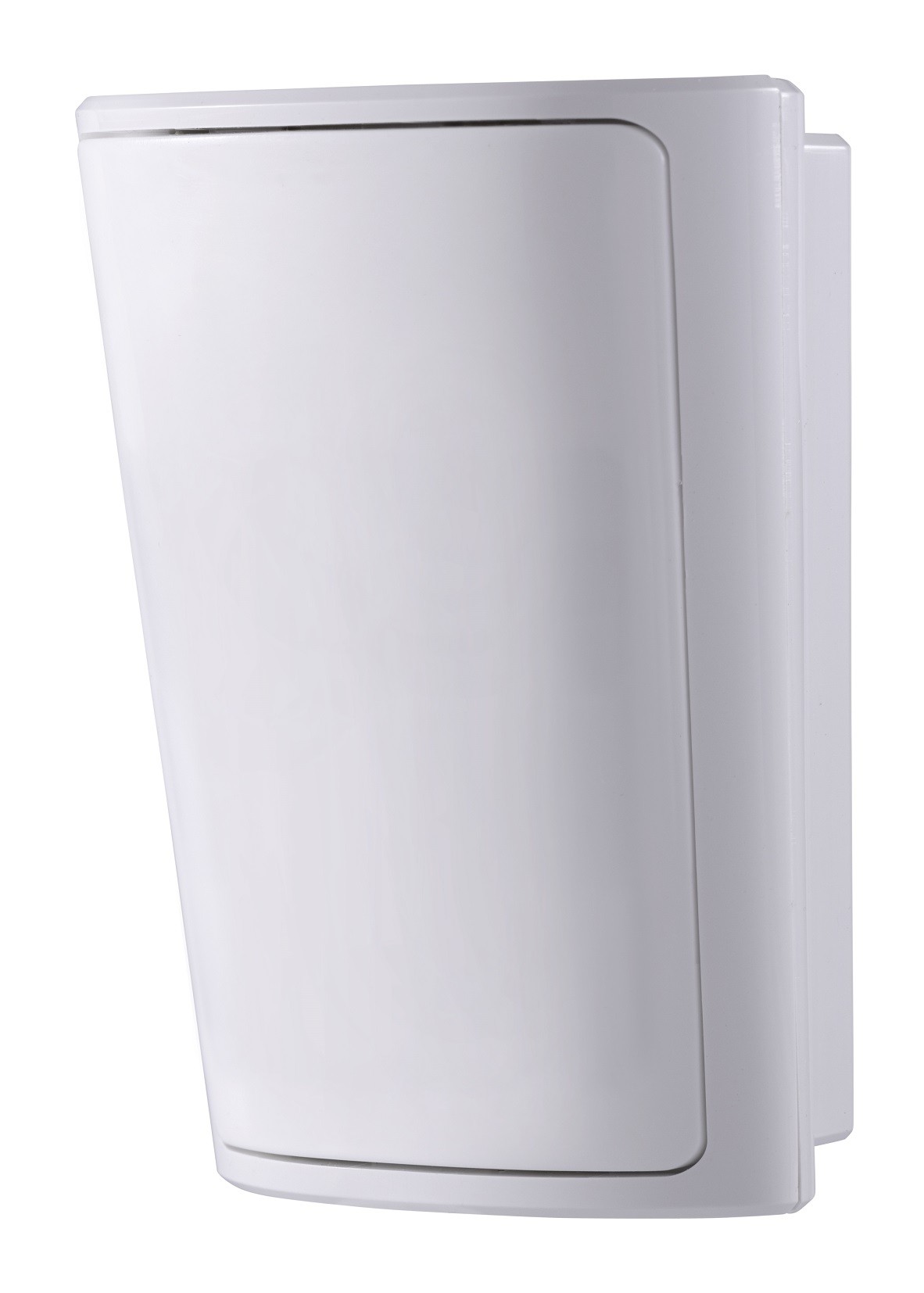Bezprzewodowa, dwufunkcyjna czujka ruchu z komunikacją dwukierunkową i miernikiem temperatury, przeznaczona do montażu wewnętrznego.