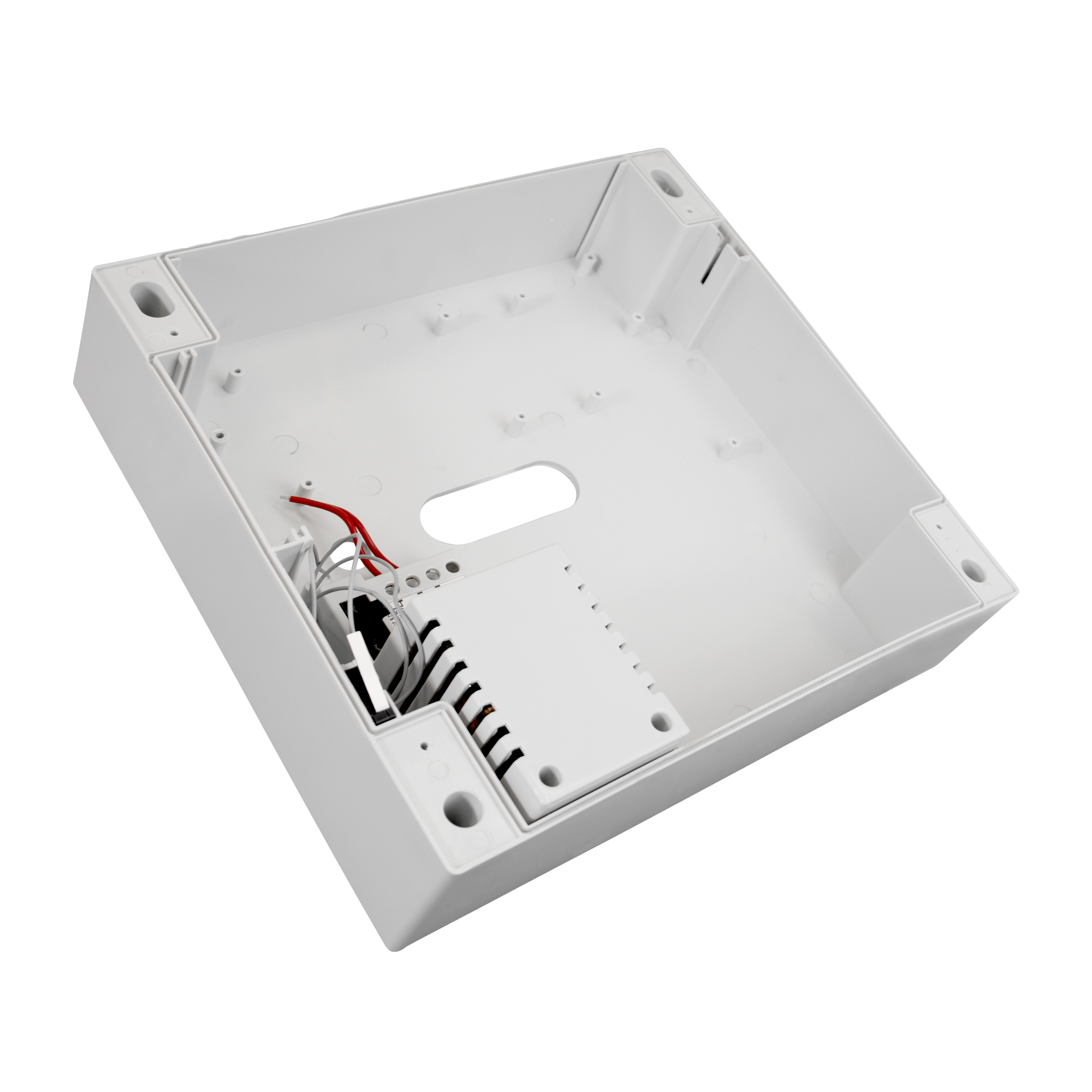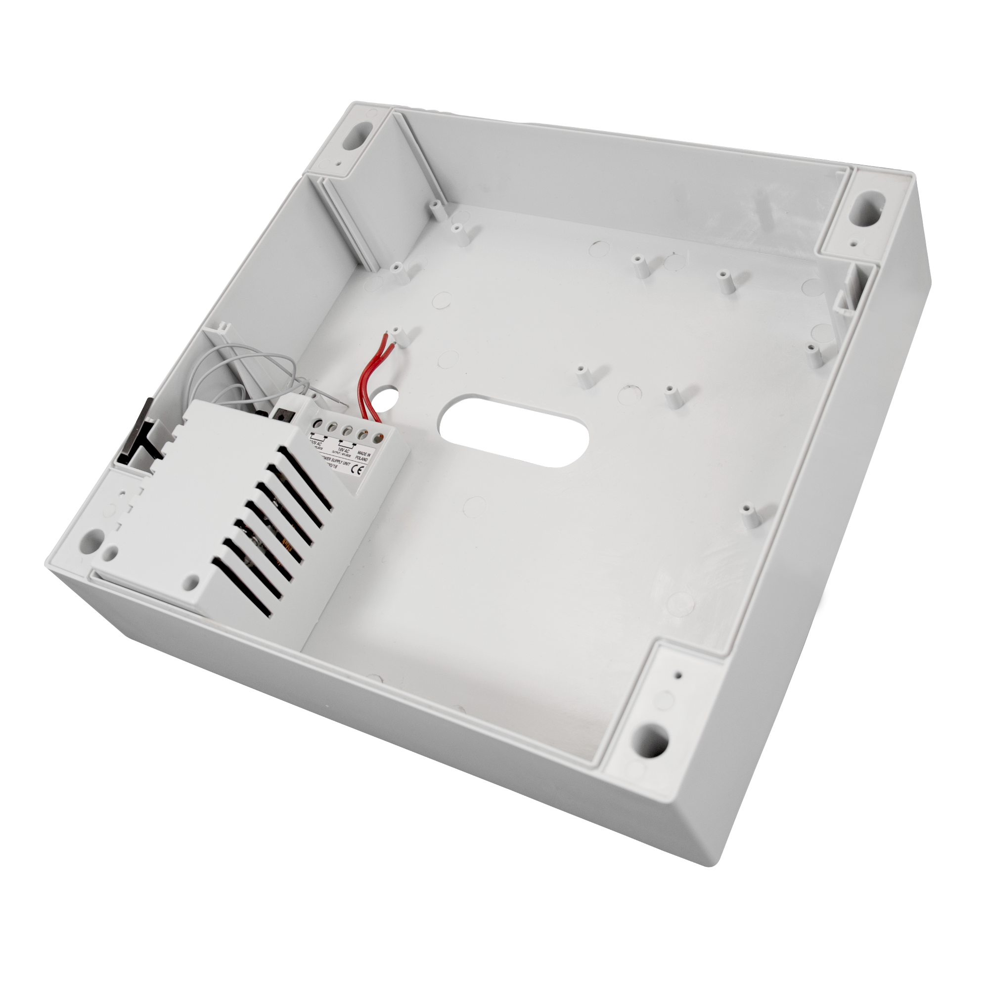 Plastikowa obudowa do central alarmowych z transformatorem i zabezpieczeniem antysabotażowym. Miejsce na akumulator 7Ah.